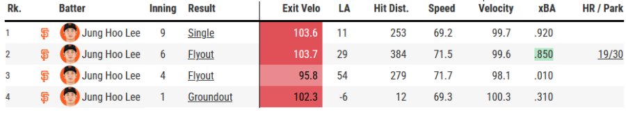이정후는 평균구속 99마일의 포심패스트볼을 잘 공략해 하드히트 타구를 만들었고 마지막 타석 드디오 안타를 만들어내 8경기 연속안타 행진을 이어갔다. 95마일 이상 타구에 적응이 아닌 강점을 보이고 있다고 해도 과언이 아닐 것이다. 이정후는 2개의 호수비를 보이며 중계카메라의 원샷을 타격이 아닌 수비장면에서도 받기도 했다. 슬로비디오는 기본.