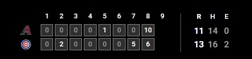시카고 컵스가 애리조나 다이아몬드백스를 상대로 13-11 역전승을 거두며, 역사적인 8회 타격전을 펼쳤습니다. D-백스는 8회 초에만 10점을 폭발시키며 대역전했지만, 컵스는 그에 질세라 8회 말에 6점을 추가하며 재역전했다.