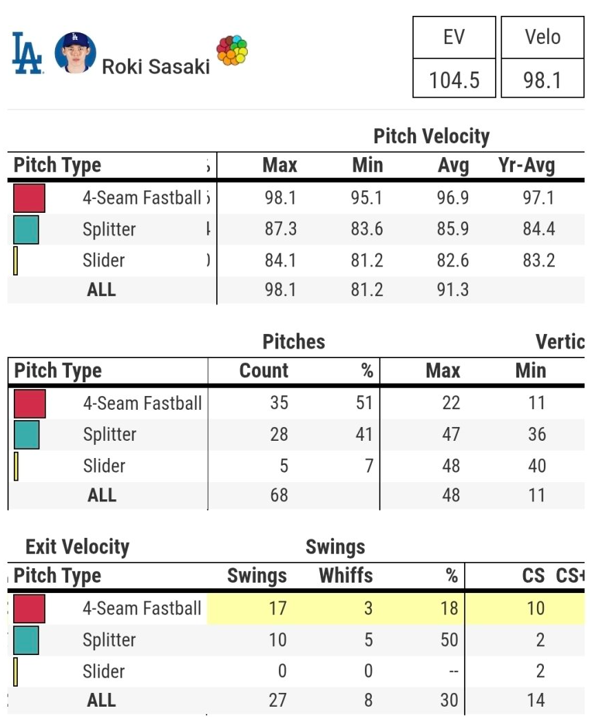 테오의 클러치 송구 하나에 시티즌뱅크 파크는 순간 침묵이 흘렀고, 6회초 콘포토는 놀라에게 우측 담장을 넘기는 쐐기 솔로포를 날렸다. 3:1로 달아난 다저스에게는 강력한 불펜이 있었다. 6회 올라온 베시아는 3타자를 모두 삼진으로 돌려 보냈고, 캐스패리우스는 7-8회 두 이닝을 공 23개로 순삭, 태너 스캇은 먼시의 실책성 플레이에도 공 3개로 3명의 타자를 잡아내는 세이브를 올렸다. 하퍼의 3루 내야안타 후 카스텔라노스의 초구 병살타, 마지막 타자 케플러의 좌익수 뜬공으로 투구수 3개 마무리가 만들어졌다. 다저스는 다시 승리를 챙기며 9승 1패로 MLB 전체 1위다.